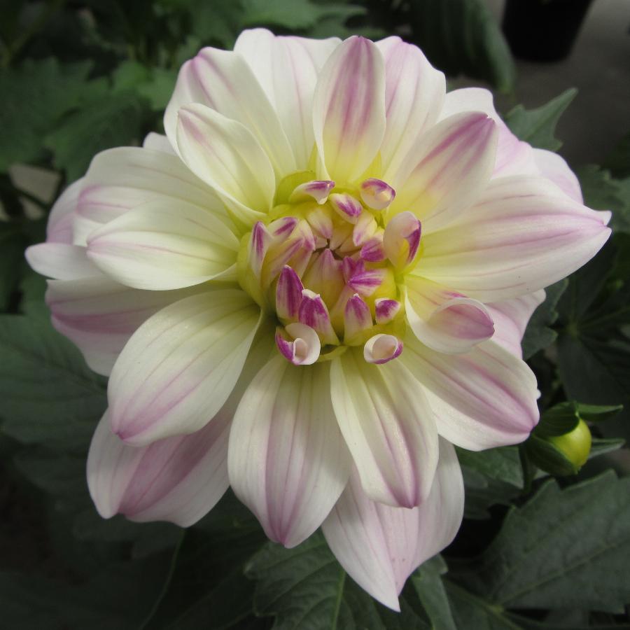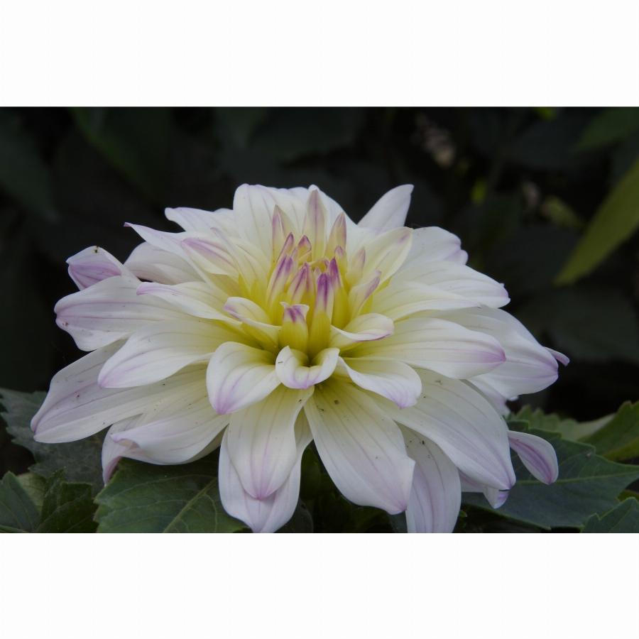 Декоративный цветок диаметром 10 см, высота растения 35-45 см. Белая георгина с сиренево-фиолетовой обводкой. Пригоден для высадки в контейнер.