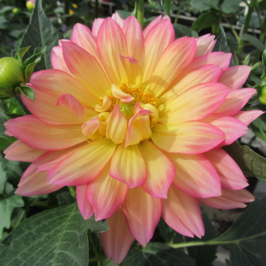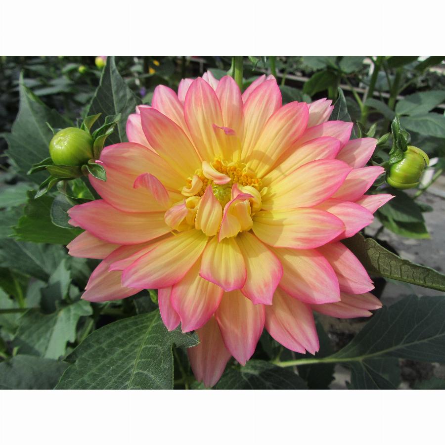 Относится к группе низкорослых георгин. Цветки махровые пастельно-розового цвета с желтой серединой. Высота растения: 0,35 м. Диаметр цветка: 10-15 см.
