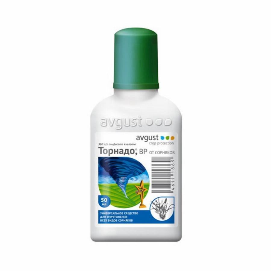 Высокоэффективный гербицид сплошного действия, обладает высокой всасываемостью и скоростью воздействия. Один из наиболее распространенных и широко применяемых гербицидов. Препарат Торнадо применяется как системный гербицид сплошного действия, применяется в садах и виноградниках, на приусадебных участках для борьбы с однолетними и многолетними сорными растениями. Он проникает в растение через листья и стебли, переходит в корневую систему и уничтожает растение целиком. Рекомендован для борьбы с такими сорняками, как пырей ползучий, свинорой, рогоз, вьюнок, тростник, бодяк.