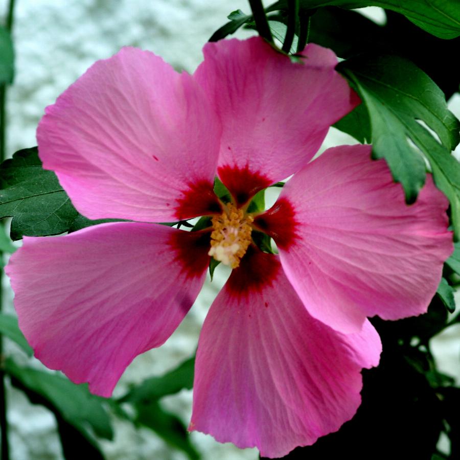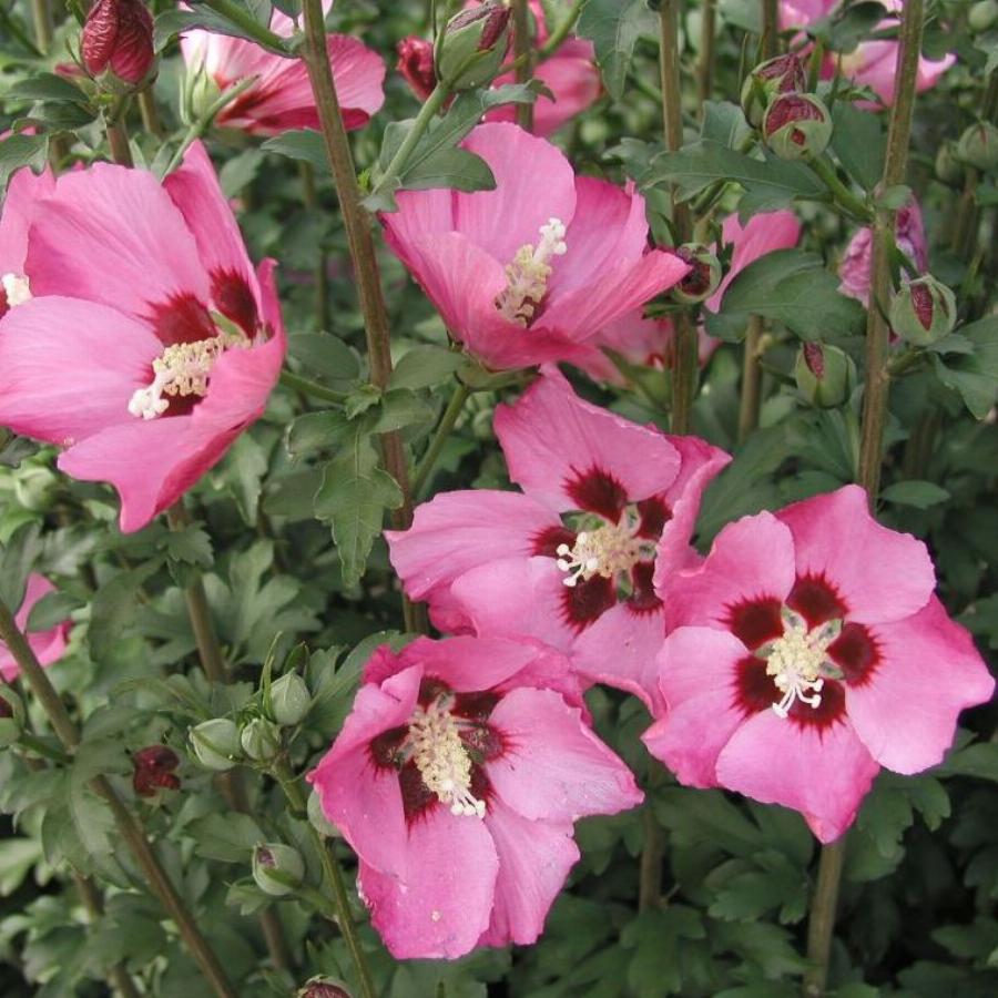 Высота до 1,5-2 метров. Цветет очень крупными цветками до 12 сантиметров в диаметре , похожими на цветы мальвы.цветки темно-розовые с красным карминным пятном Цветение с конца июня до конца сентября. Цветение очень обильное и по всей высоте куста.Предпочитает солнечное место, защищенное от холодных ветров, в суровые зимы рекомендовано укрытие на зиму.