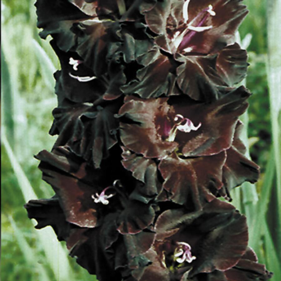 558–С–07, Г, ЛОБАЗНОВ Чёрно-красный с малиновым оттенком гладиолус. Совершенно чёрные в полуроспуске края унаследовал от знаменитого сорта Эбони Бьюти. Фактура красиво гофрированных лепестков очень плотная.