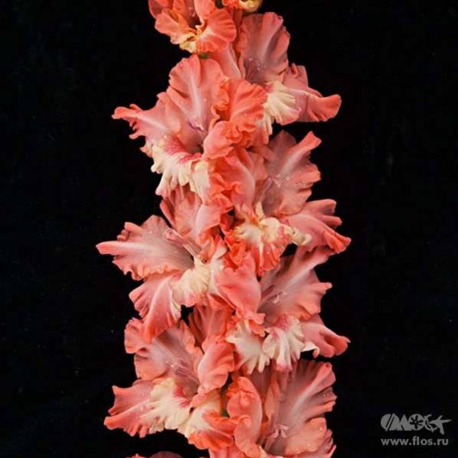 465-С-06, СГ, Трифонов. Розовый гладиолус с кремово-желтым размытам пятном и малиновым веером на нижних лепестках. Плотные ткани и укладка цветков в соцветии.