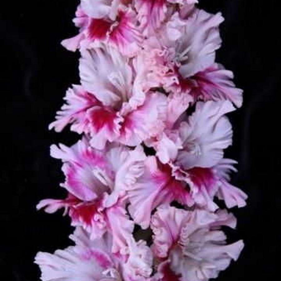 463-С, ФОТИН Светло-малиново-розовый с тёмным пятном. Цветки размером более 14 см, сильно гофрированные. В соцветии может быть 8 одновременно открытых цветков из 20. Высота 140 см. Срок цветения средний.
