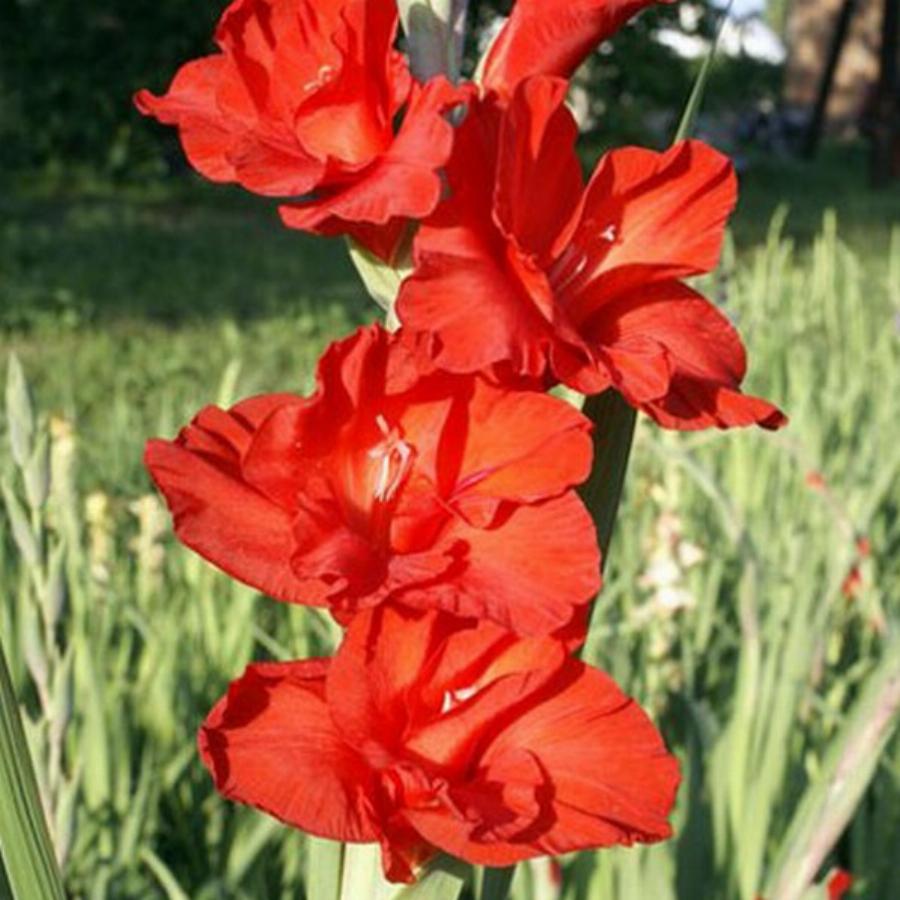 Гладиолус крупноцветковый гофрированный. Растение высотой 1 м. Имеет вертикальный неветвящийся стебель и линейные листья. Привлекает внимание крупными и пышными гофрированными кораллово-красными цветками диаметром до 12см, собранными в вертикальные соцветия.