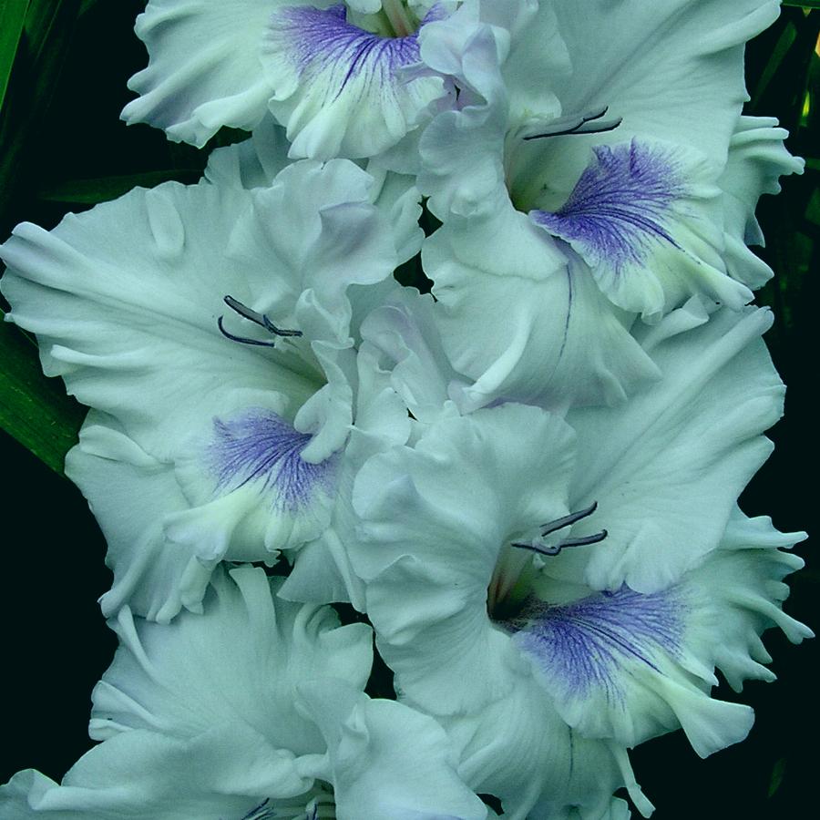 581-СР-98 ДЫБОВ В Ф. Исключительно нарядный голубой гладиолус с лучистым синим напылением на нижнем лепестке. Растение высотой 165 см. Листья темно-зеленые. Цветонос прочный, прямой.