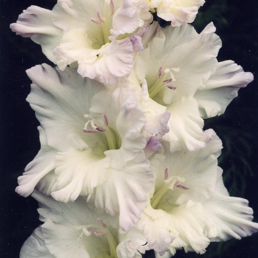 501-РС-04, СГ, ДЫБОВ В Ф Белый сильногофрированный цветок с голубой прозрачной каймой. Соцветие двухрядное, стройное с хорошими ростовыми качествами. Держит открытыми до 10 цветков.
