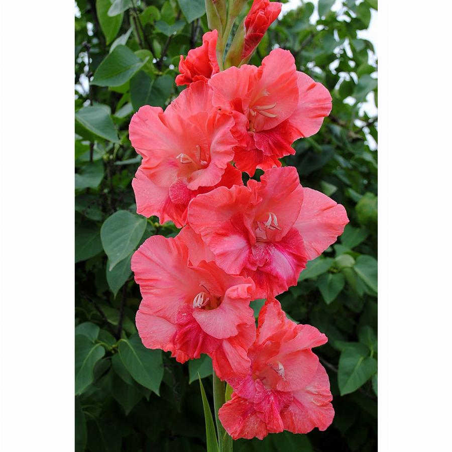 565-С-2010, СГ, ДЫБОВ. Крупные (диаметр 15 см) малиново-розовыые цветы с высветлением к центру и ярким малиновым пятном на нижних лепестках. Длинное (80 см) идеально двурядное соцветие. Прикрепление бутонов прочное. Цветонос прямой, жёсткий. Хорошо растущий сорт с высокой устойчивостью к болезням.