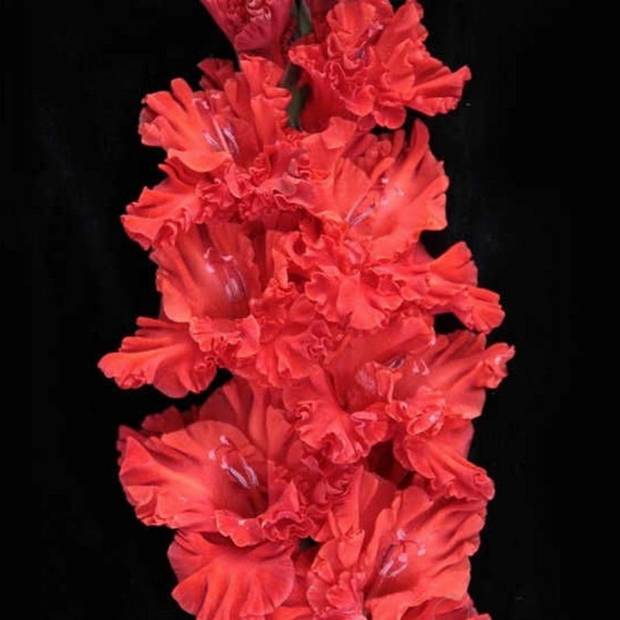 454-С, АДАМОВИЧ. Большие ярко-красные цветы с красивой сильной гофрировкой и плотно уложенным соцветием. Прочный колос.