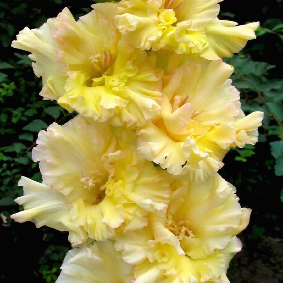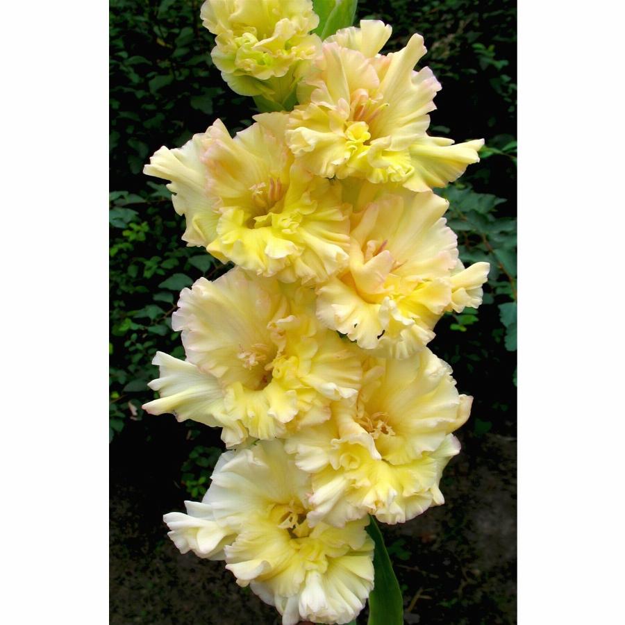 514-СР-99, ССГ, 24/12 ДЫБОВ В Ф. Нежно-лимонно-жёлтый цветок, с переходом в светло-розовые полутона. Цветы сильно гофрированные глубокими складками. В идеально двухрядном колосе 24 бутона, одновременно открыты 12 цветков! Отличная срезка!