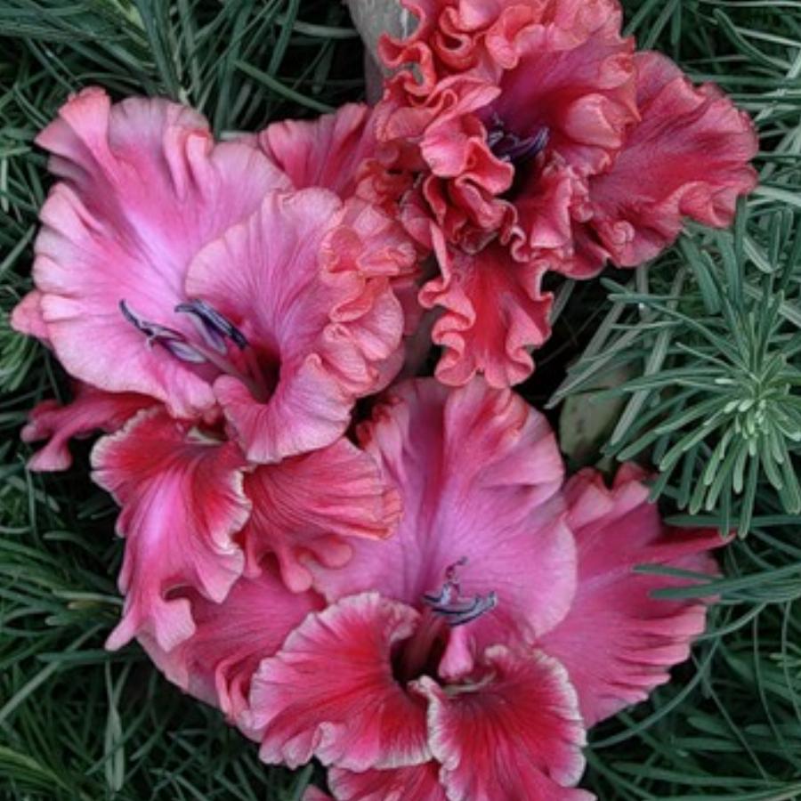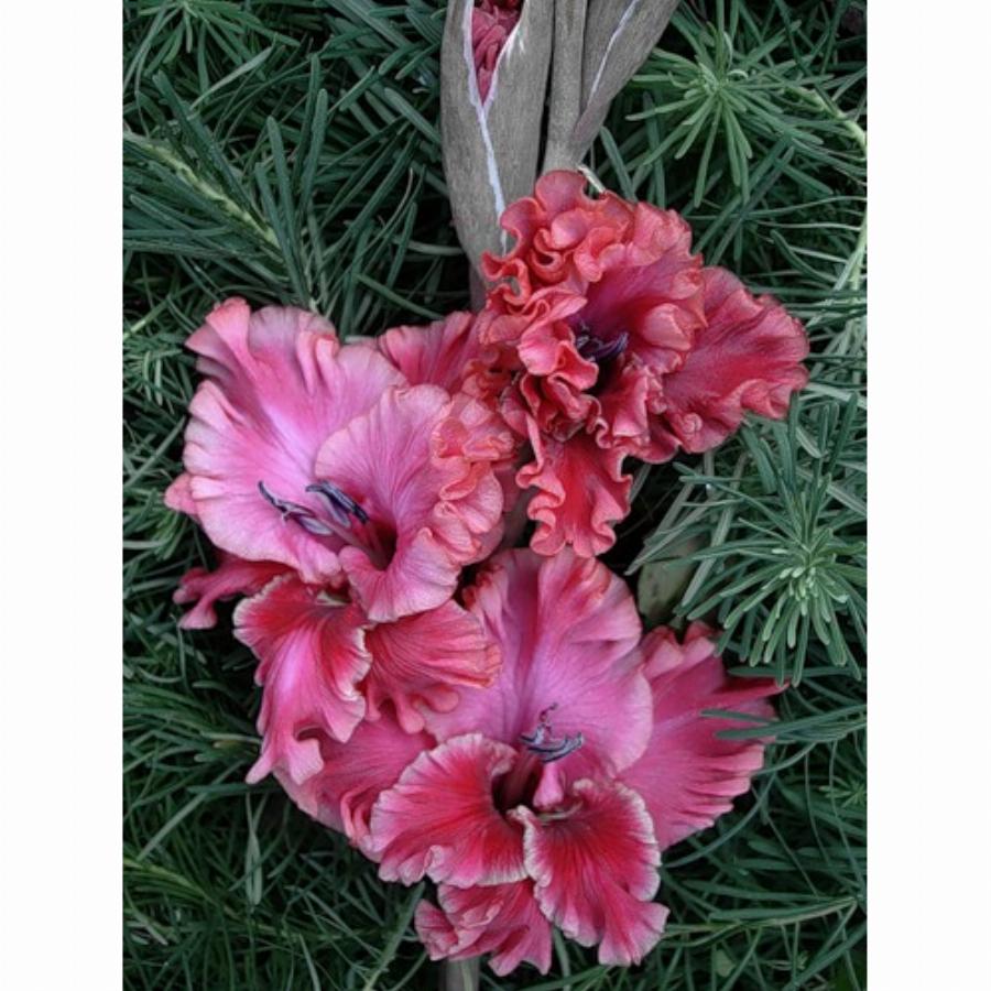 67-С-06, ССГ, ДЫБОВ В Ф. Гладиолус насыщенно-малиновый, нижние лепестки в тонкой серебристой оправе. Цветы сильно-сильно гофрированные. Фактура лепестков необыкновенно плотная.