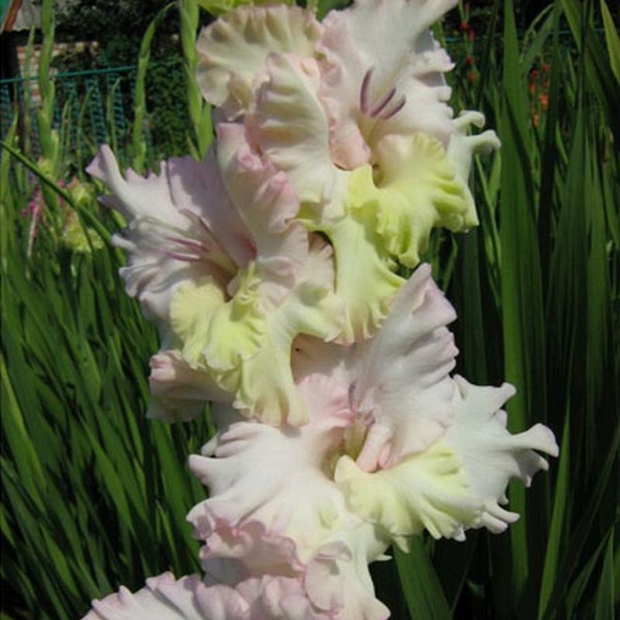 473-Р-00, СГ, 20/9, Самойленко Нежно-бело-розовый с кремовым нижним лепестком. Сильно гофрированный. Фактура лепестков очень плотная. Размер цветков 11,5-14 см. Колос двухрядный. Держит в роспуске одновременно 9 цветков. Ранний, неприхотливый и очень выносливый сорт.