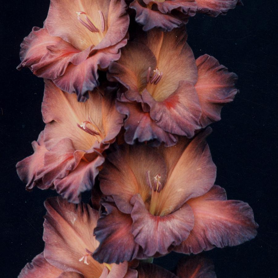 598-СР-95 Дыбов, Г, 22/9. Дымчато-коричневый с фиолетовым оттенком гладиолус. Мощное растение, высокое прочное соцветие. Очень красивое сочетание коричнево-фиолетовых тонов. Входит в пятёрку лучших коричневых гладиолусов!