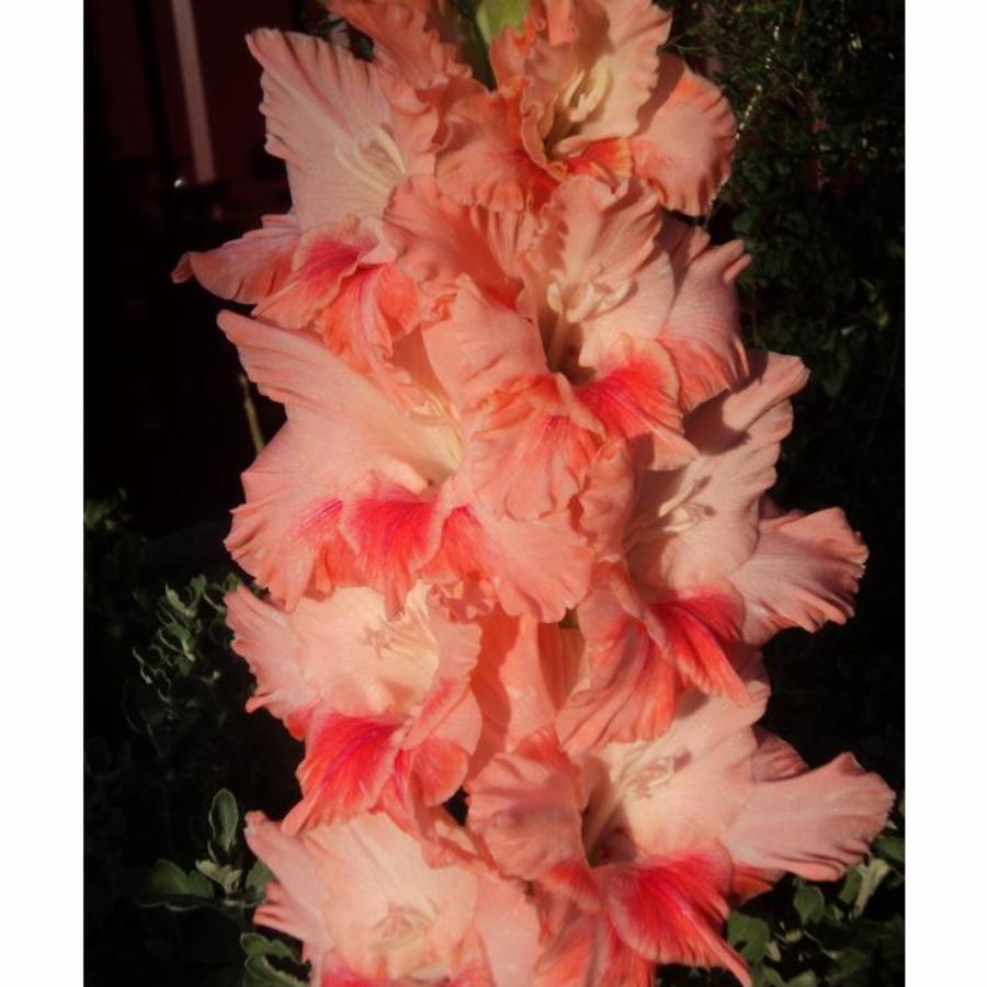 501-СР-03, КИСЕЛЕВ. Светло-розовый гладиолус с ало-красным пятном на нижнем лепестке. Оригинальная волнистая гофрировка по краям лепестков. Соцветие идеально двухрядное с плотной укладкой. Отличное здоровье. Яркая очень ранняя срезка!