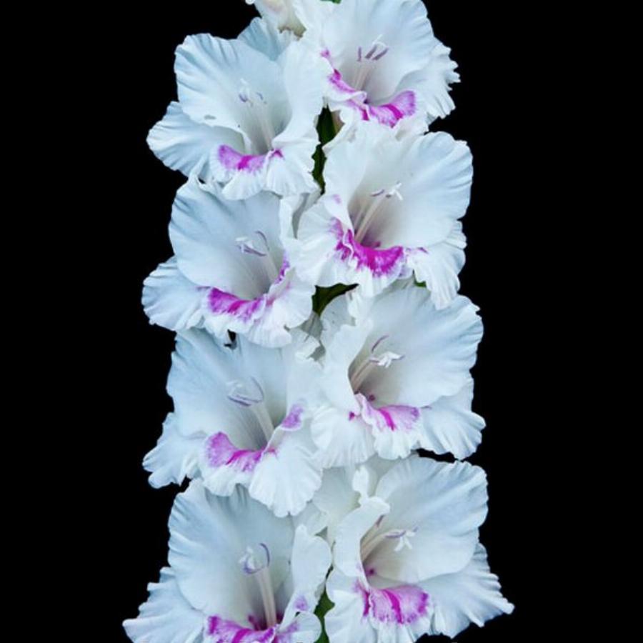 401-С-1999-Г- Клути. Высота 140 см. Соцветие 70 см, 24 бутона (одновременно открыты 9). Бутон 12 см.Стройный колос из белых цветков с напылённым малиново-пурпурным пятном на нижнем лепестке. Сорт неоднократно становился лауреатом и победителем всеамериканских выставок. Срезка из любых луковиц..