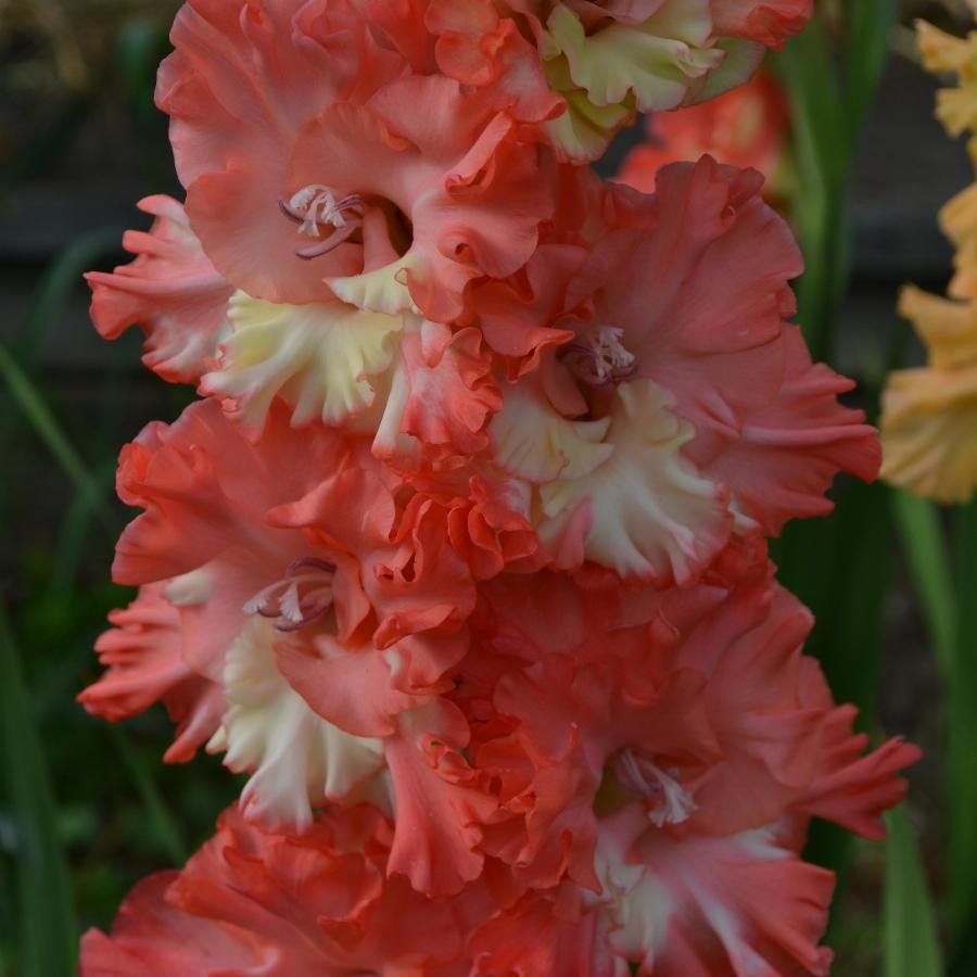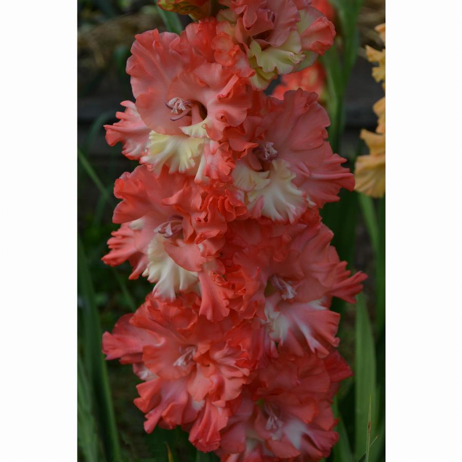 445-С-10, ССГ, 23/8 ВАСИЛЬЕВ С А. Лососево-розовые цветы с бело-кремовыми мазками на нижних лепестках. Диаметр цветка 13 см, соцветие 80 см, высота растения 140 см. Цветы с очень сильной гофрировкой.