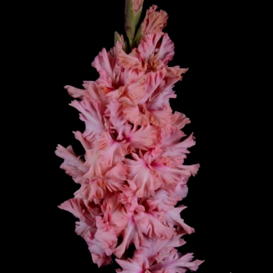 463-С, ФОТИН. Супер гофрированный цветок нежной окраски-триколор! Цветок нежно розовый, края лепестков лососевые, а горловина малинового цвета. Соцветие высокое, одновременно открыто 9 бутонов.