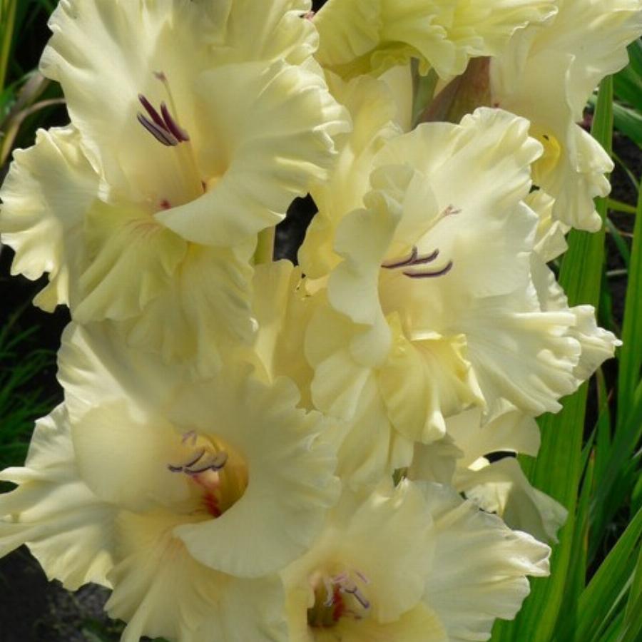 512-РС-03, СГ, ЛОГУТИНСКИЙ. Нежно-лимонный гладиолус, у основания нижних лепестков цветка окраска чуть гуще и на этом фоне малиновые прожилки. Перфорированнный лепесток с тиснением.