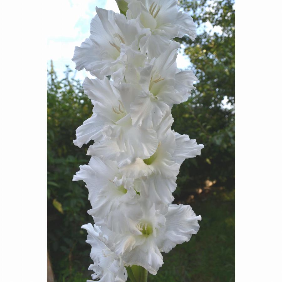 400-Р-10, СГ, 20/8, ВАСИЛЬЕВ. Цветы гладиолуса чисто белые с белыми тычинами. Диаметр цветка 12,5 см, соцветие 70 см, высота растения 135 см. Новый сорт в группе белых с ранним сроком цветения.