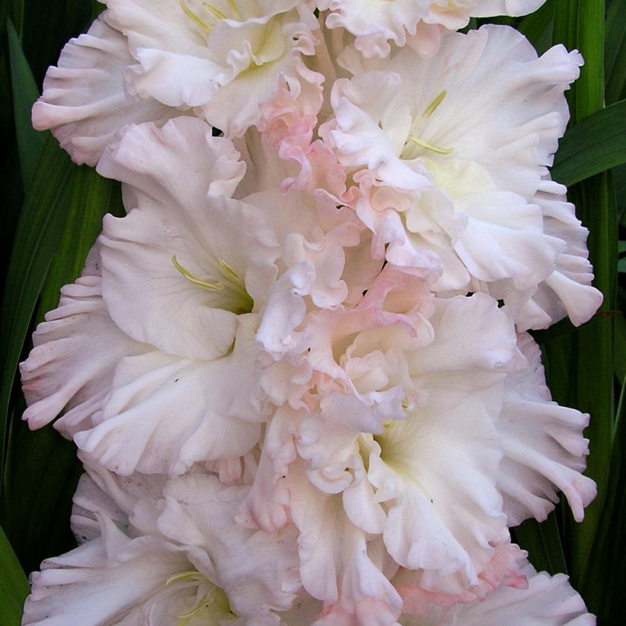 540-С-07, ССГ, 25/12, ДЫБОВ Огромные, складчатые цветы с супер плотной фактурой, почти белые с лёгким нежнейшим розовым оттенком. Гофрировка очень сильная, горло закрыто защипами. Монументальное соцветие из 25 бутонов держит открытыми 12 суперплотных, искрящихся на солнце цветка! Красивейший, новый сорт гладиолуса