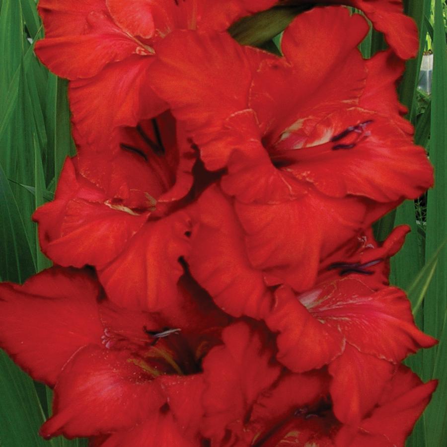 556-РС-02,СГ, 24/12, ДЫБОВ. Очень яркий, красно-бордовый гладиолус. Большие (15-16 см) цветы сильно гофрированы складками и защипами. Мощное растение с длинным 90 см соцветием. Один из лучших сортов в группе красных.