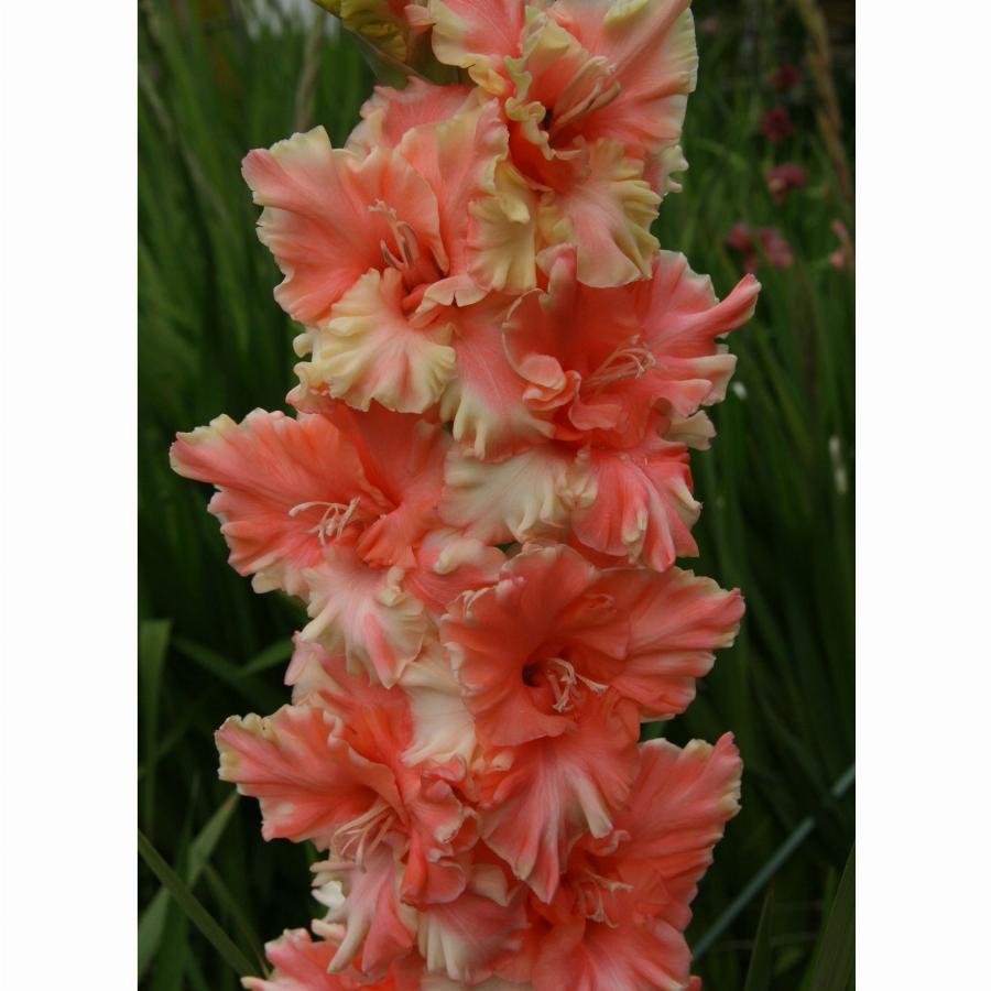 536-Р-07, СГ, 18/7, ЛОБАЗНОВ. Лососево-оранжевый с более тёмными оранжево-красными наплывами на нижних лепестках. Громадное растение с гвоздичной гофрировкой. Соцветие 85 см. Жизнеспособный сорт с ранним сроком цветения.
