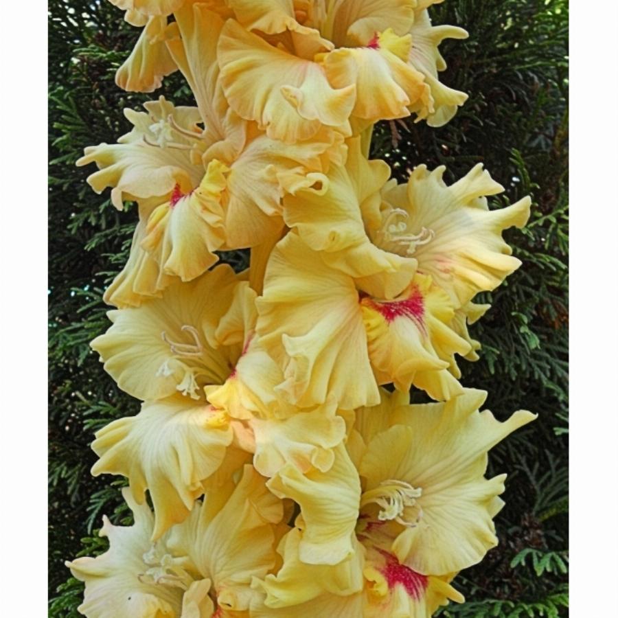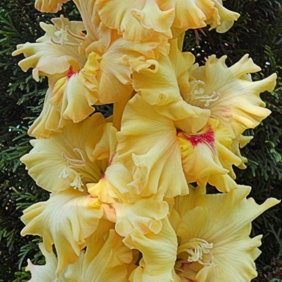 413, РС, 2006, СГ, Ушаков. Насыщенная желтая гамма с ярким красным пятном на нижнем лепестке, имеет крупные защипы по краям лепестков.