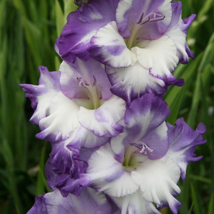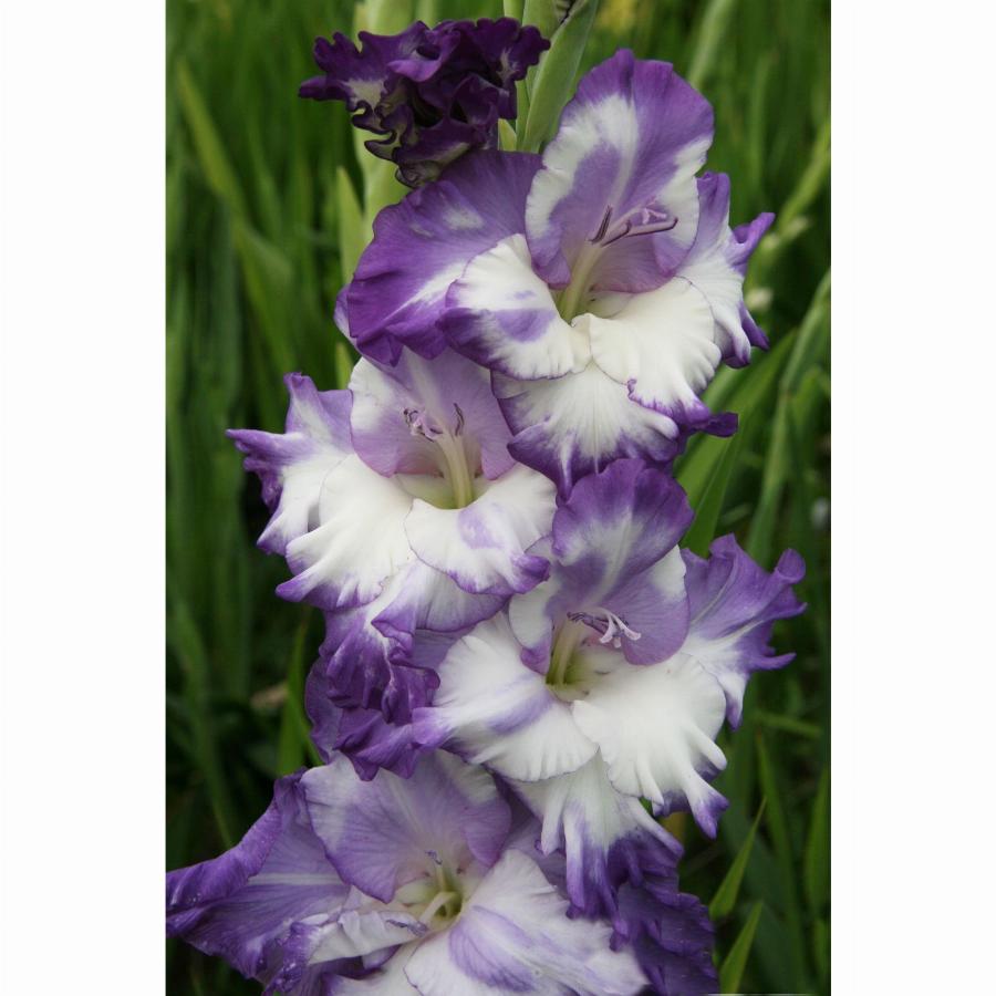 485-ОР-07, ЛОБАЗНОВ. Очень рано цветёт — 77 дней от осадки до цветения. Насыщенный, фиолетово-синий с контрастной белой серединой. Сильную гофрировку набирают только крупные клубнелуковицы. Контрастная, ранняя срезка.