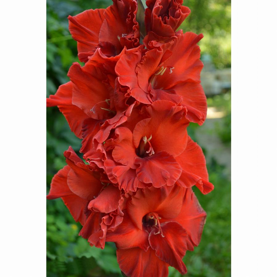 556-С-97, ВАСИЛЬЕВ. Насыщенно-красный гладиолус-гигант с огромными бархатными цветами. Нижний лепесток более тёмной тональности. Очень плотная фактура умеренно гофрированных цветов. Идеально двухрядное соцветие с плотной укладкой. Цветок-праздник!