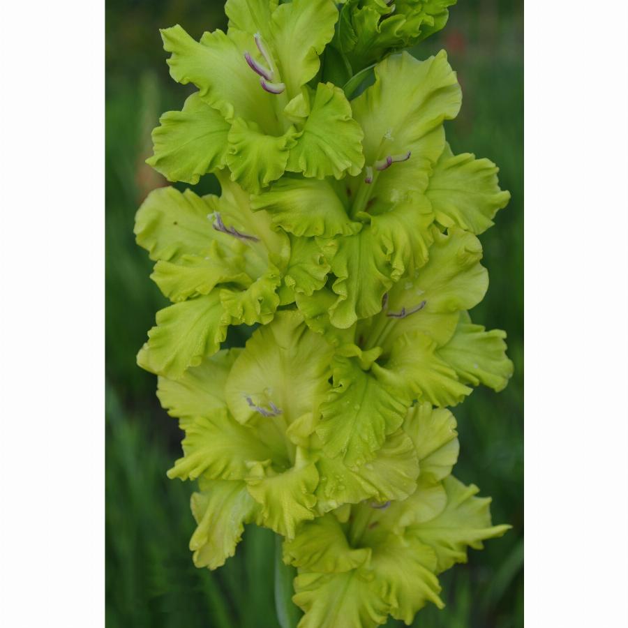 404-РС-2010, ВАСИЛЬЕВ Салатово-зелёный гладиолус с сильно гофрированными цветками. Диаметр цветка 12 см, соцветие 60 см, высота растения 130 см.