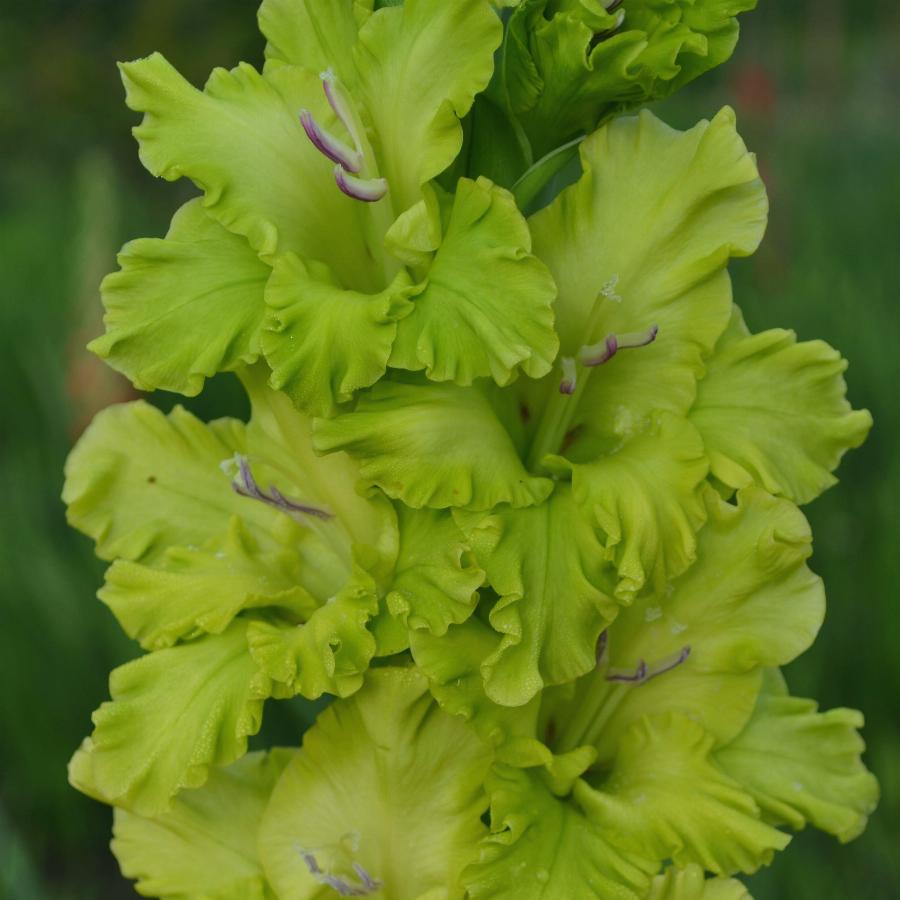 404-РС-2010, ВАСИЛЬЕВ Салатово-зелёный гладиолус с сильно гофрированными цветками. Диаметр цветка 12 см, соцветие 60 см, высота растения 130 см.