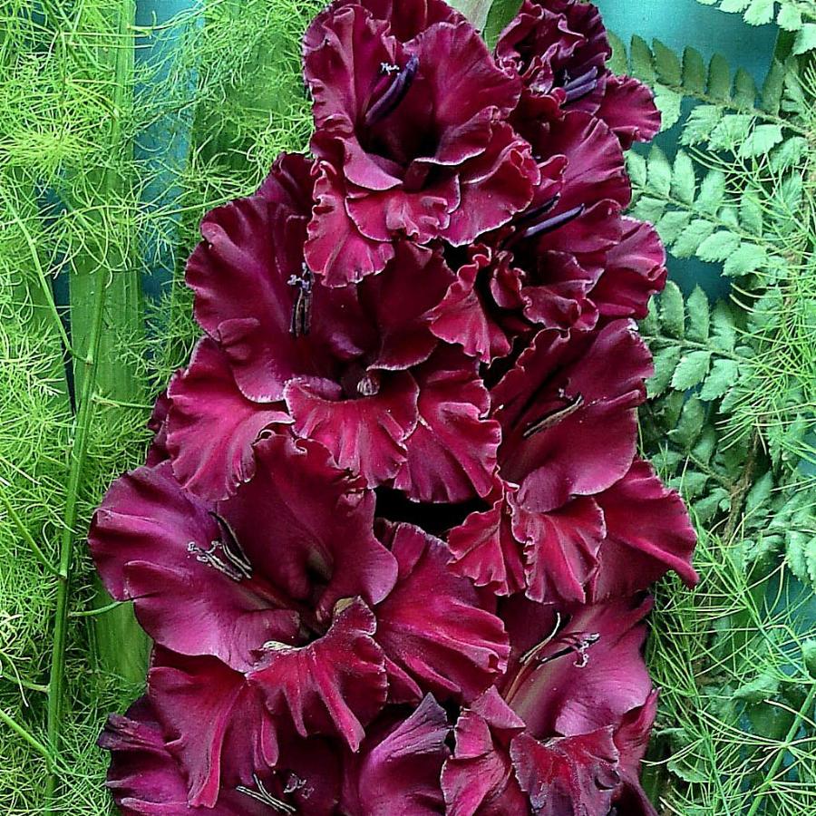 458-РС-06, БАРАНОВ Бархатные, сильно гофрированные цветы с чистой, чёрно-красной окраской. Высокое идеально двухрядное соцветие с плотной укладкой цветов. Мощный, отлично растет. Завораживающая красота!