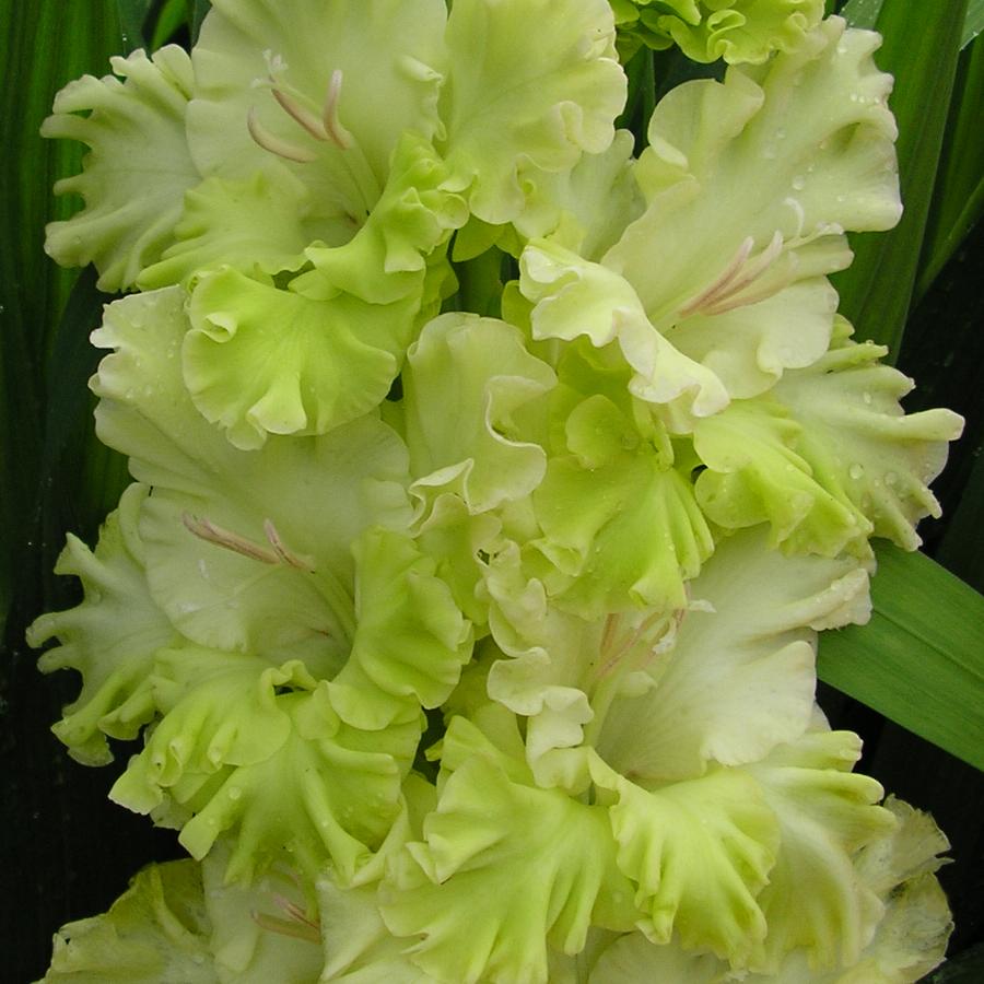 505-СР-05, ССГ, ДЫБОВ Один из лучших зелёных гладиолусов. Верх гофрированных цветков салатово-зелёный, окраска нижних лепестков насыщеннее. Крепкий колос из 23 бутонов держит открытыми до 9 гофрированных красивыми складками цветков с плотной фактурой лепестков.
