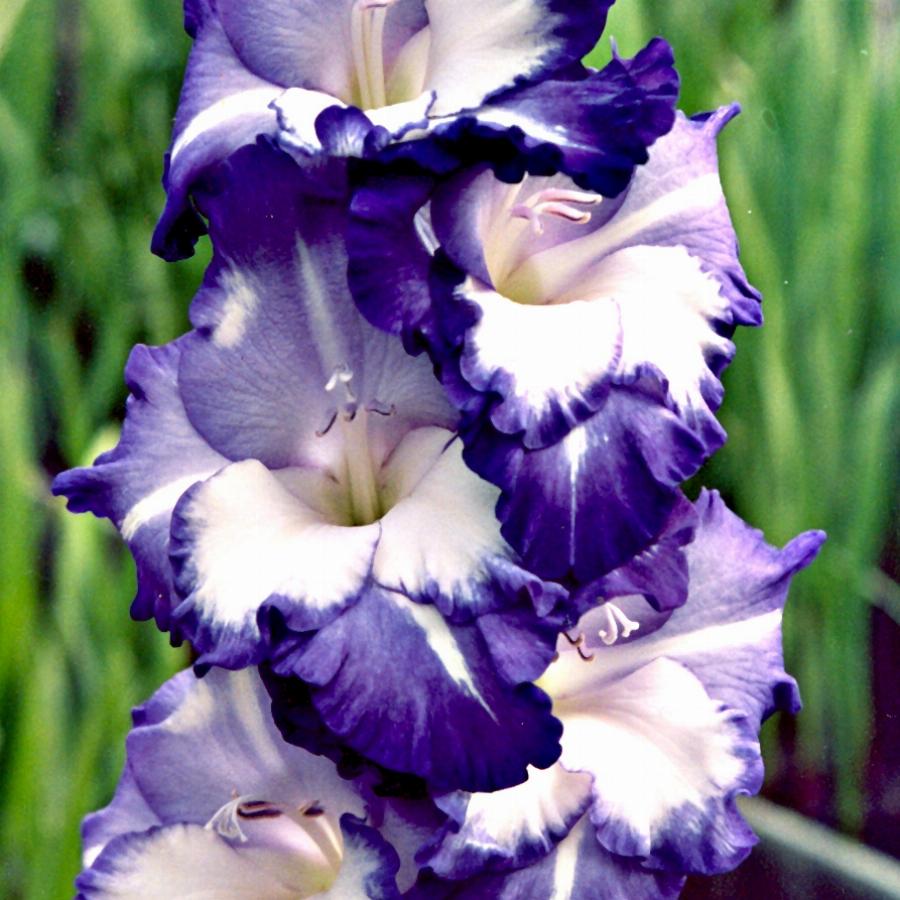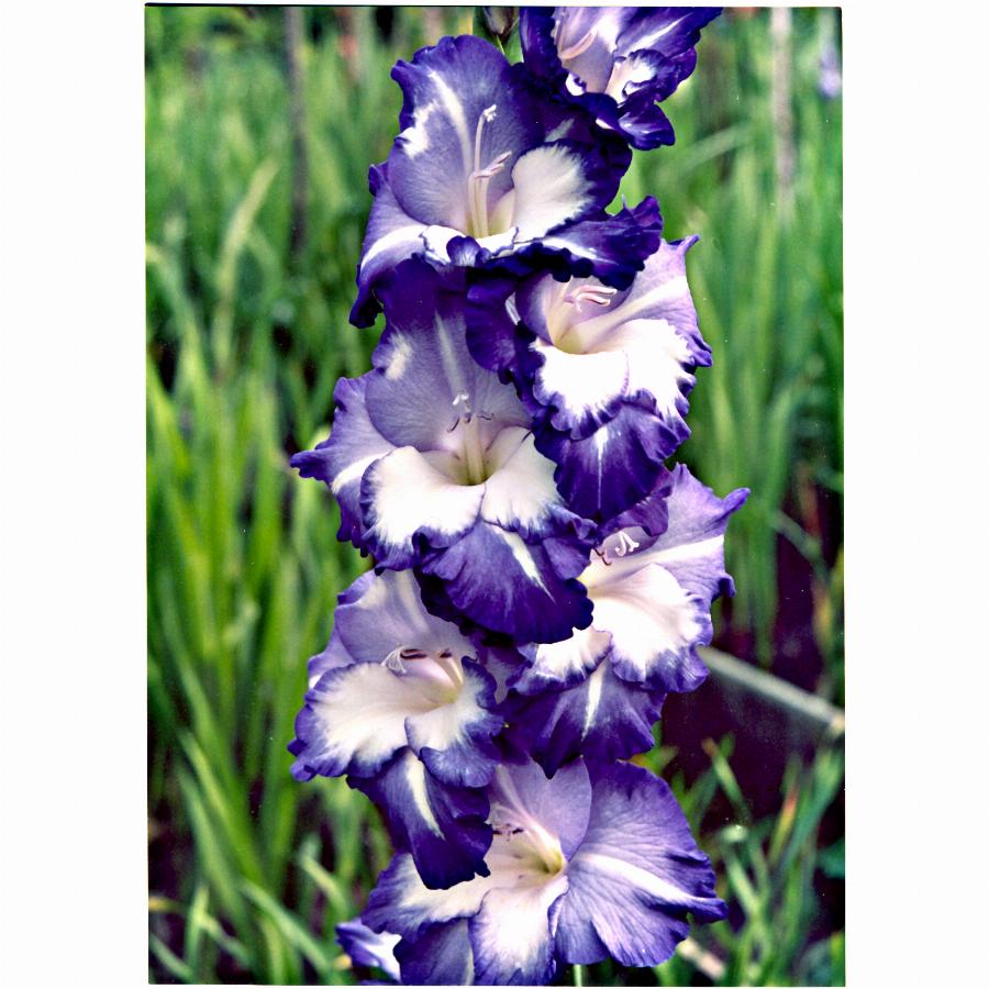 585/485-Р-05, СГ, ЛОБАЗНОВ. Края лепестков фиолетово-чернильные, в центре большое белое пятно с белыми стрелками на лепестках. Соцветие прочное, плотно уложенное. Высотой 1,4 м.