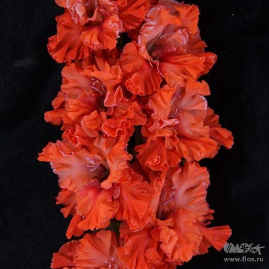 (456, с, Фотин) Мощнейший гладиолус с двумя цветоносами. всота растения до 2 м, 21 цветок, 8 открыты одновременно.Цветки крупные, ярко-красные, гофрированные, плотной фактуры. Хорош для срезки.