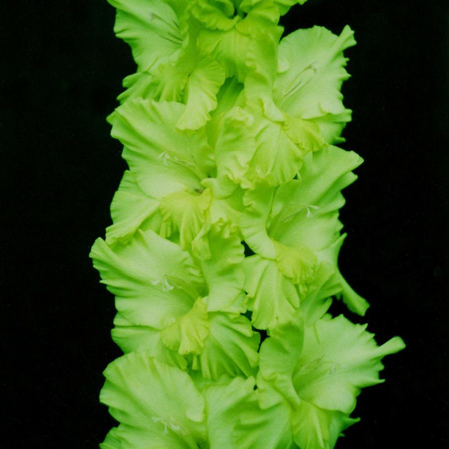 504-С-03, Г, ВАСИЛЬЕВ С А. Цветы салатово-зелёной окраски с более тёмным нижним лепестком. Окраска лепестков напоминает отражённые через лёд блики солнца. Небольшая гофрировка красивая, волнистая. Соцветие стройное, плотное. Необычный красивый сорт гладиолуса!