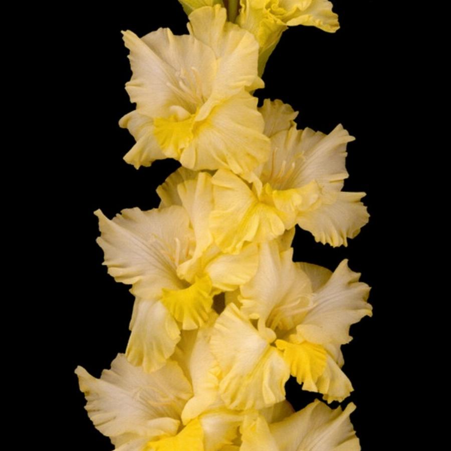 (412, с, Евдокимов) Высота 1,5 м. Соцветие 75см, 22 бутона (8 одновременно открыты).Бутон 13см. Лимонно-желтый с более насыщенным нижним лепестком. Хорошо гофрирован защипами по всему бутону, ткань лепестков плотная, прочная, устойчивая к солнцу и непогоде. Хорошая транспортабельная срезка.
