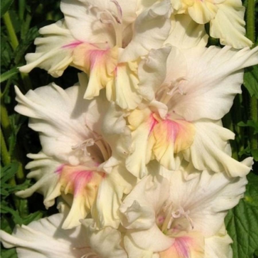 500-С, ЛОБАЗНОВ. Бело-кремовый с малиновым напылением в горле. Гофрировка сильная. Фактура лепестков плотная. Размер цветков 15 см. Соцветие идеально двухрядное, длиной 70 см. В соцветии может быть 10 одновременно открытых цветков из 23. Стройный гладиолус высотой 150 см, мощный и красивый. Превосходная срезка. Срок цветения средний.