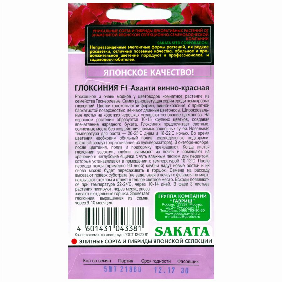 ГЛОКСИНИЯ АВАНТИ F1 ВИННО-КРАСНАЯ 5 ШТ гавриш