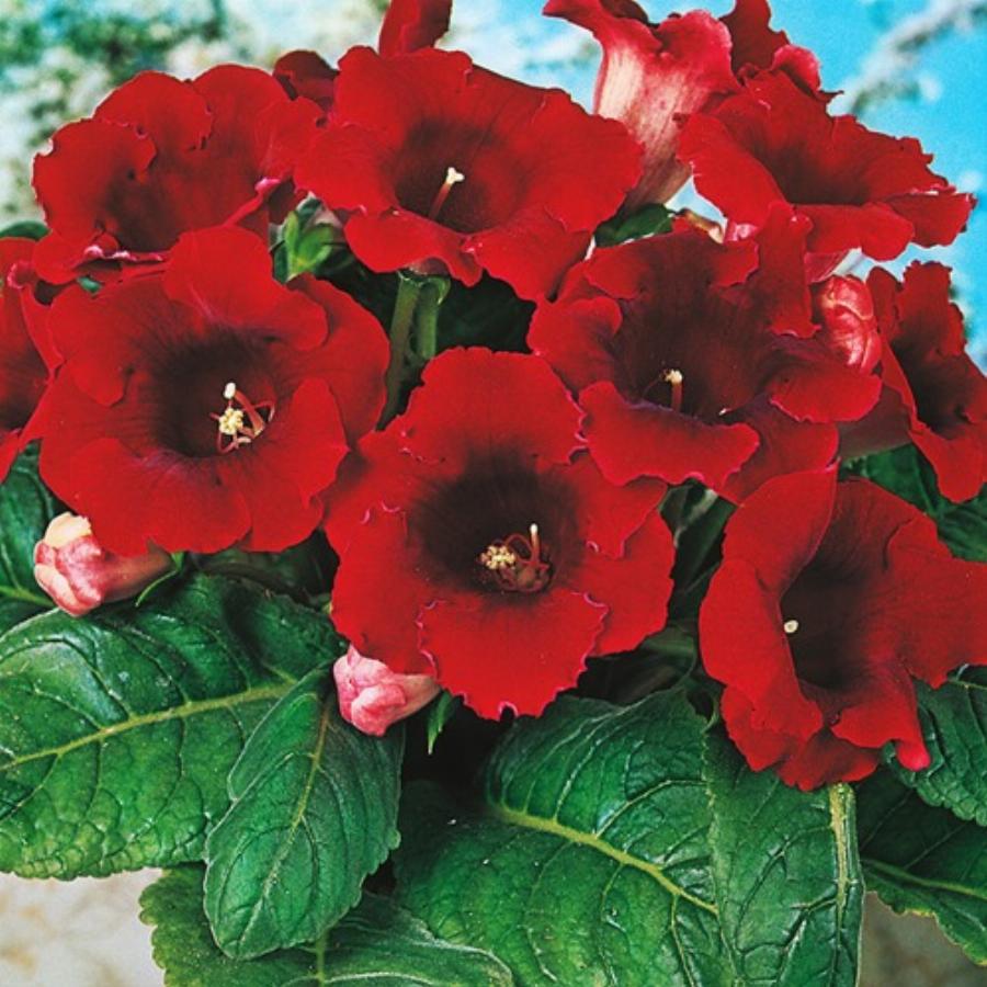 Прекрасное комнатное растение с крупными колокольчатыми цветками диаметром до 8 см. Куст компактный, с крупными темно-зелеными, опушенными листьями. Цветение через 2-3 месяца после посадки луковиц. Цветущим глоксиниям необходимо хорошее освещение, но от прямых лучей солнца их следует притенять. Поливать следует теплой водой, под корень.