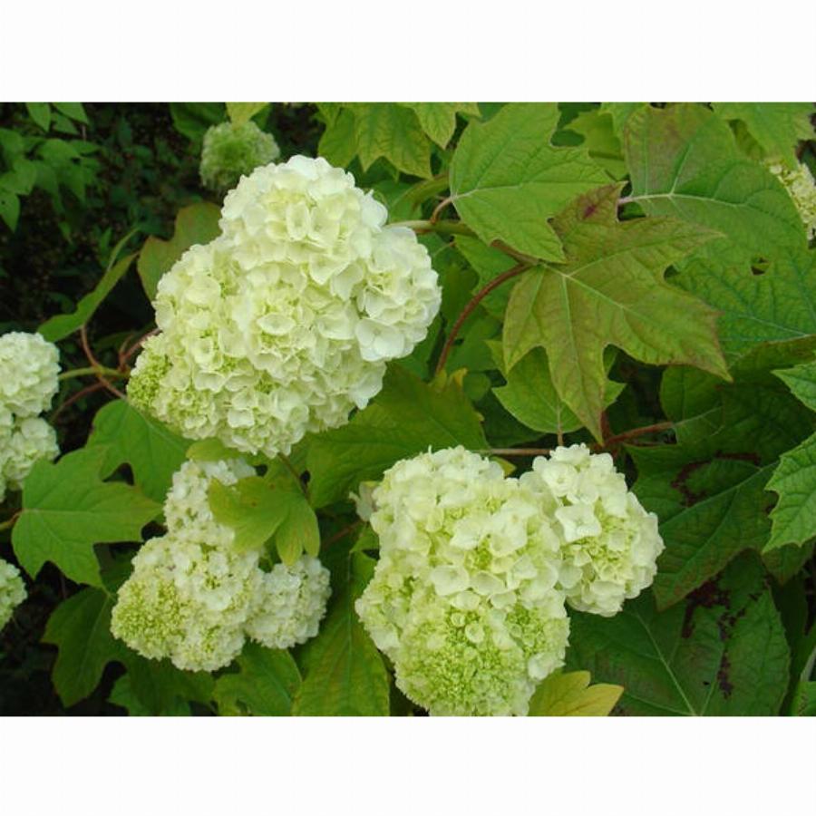 Кустарник высотой до 2 метров. Цветки белые, с легким ароматом. Соцветия 20-25 см, плотные. Цветет на отрастающих однолетних побегах с середины лета. Листья темно-зеленые, дубовидные (до 16 см в длину) имеют грубую структуру, осенью приобретают бордовый окрас.