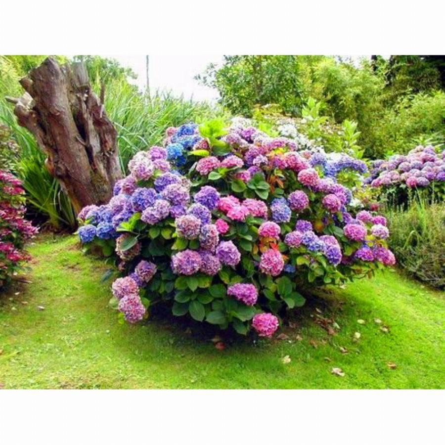 Четырехлепестковые цветы синего цвета собраны в округлые соцветия до 15-20 см, расположенные на концах побегов. Побеги растут вертикально, быстро. Куст среднего размера высотой 1,5 м. Окраска цветков легко меняется: для этого, перед цветением растение поливают, алюминиевыми квасцами, тогда розовый цвет станет сине- голубым, сиреневым. Гортензия предпочитает кислые почвы.