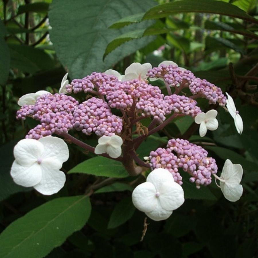 Высота до 1,5 м. Это растение с бархатистой темно-зеленой листвой и огромными цветочными головками, которые раскрываются в конце лета. Внутренние цветки фиолетовые, они, как нимбом, окружены внешними, бледно-розовыми. Отличный медонос. Предпочитает полутень. Требует укрытия на зиму. На форумах пишут, что в Москве с укрытием зимует неплохо.