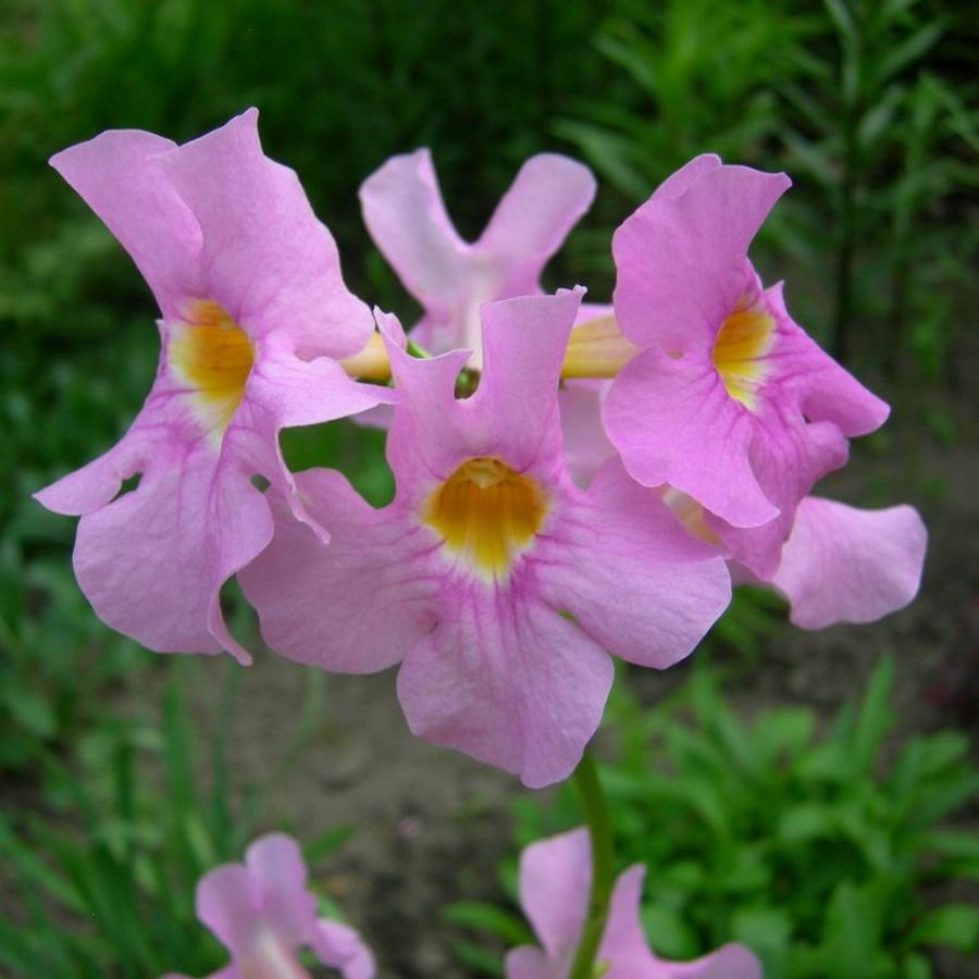 Инкарвиллея Делавея Розовая Магнолия.Необычное,редкое в садах растение.Эффектные,крупные,диаметром до 6 см,цветки сиренево-розового цвета.Листья собраны в прикорневой розетке,немногочисленные,перисто-раздельные,до 30 см.длиной,кистевидное соцветие до 30 см. в в высоту.Цветение продолжительное-30-35 дней.Рекомендуется выращивать в полутени