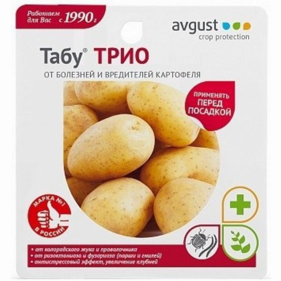 Комплект трёх препаратов Табу Трио (Табу+Синклер+Зеребра Агро) применяется в виде баковой смеси для опрыскивания клубней картофеля от болезней, колорадского жука, проволочника и погодных стрессов перед посадкой. Подавляет почвенные инфекции — ризоктониоз (парша), фузариоз (гнили) до 12 недель. Защищает от колорадского жука и проволочника до 45 дней. Стимулирует иммунитет растений, повышает урожайность, количество и размер клубней. Здоровому урожаю — быть!