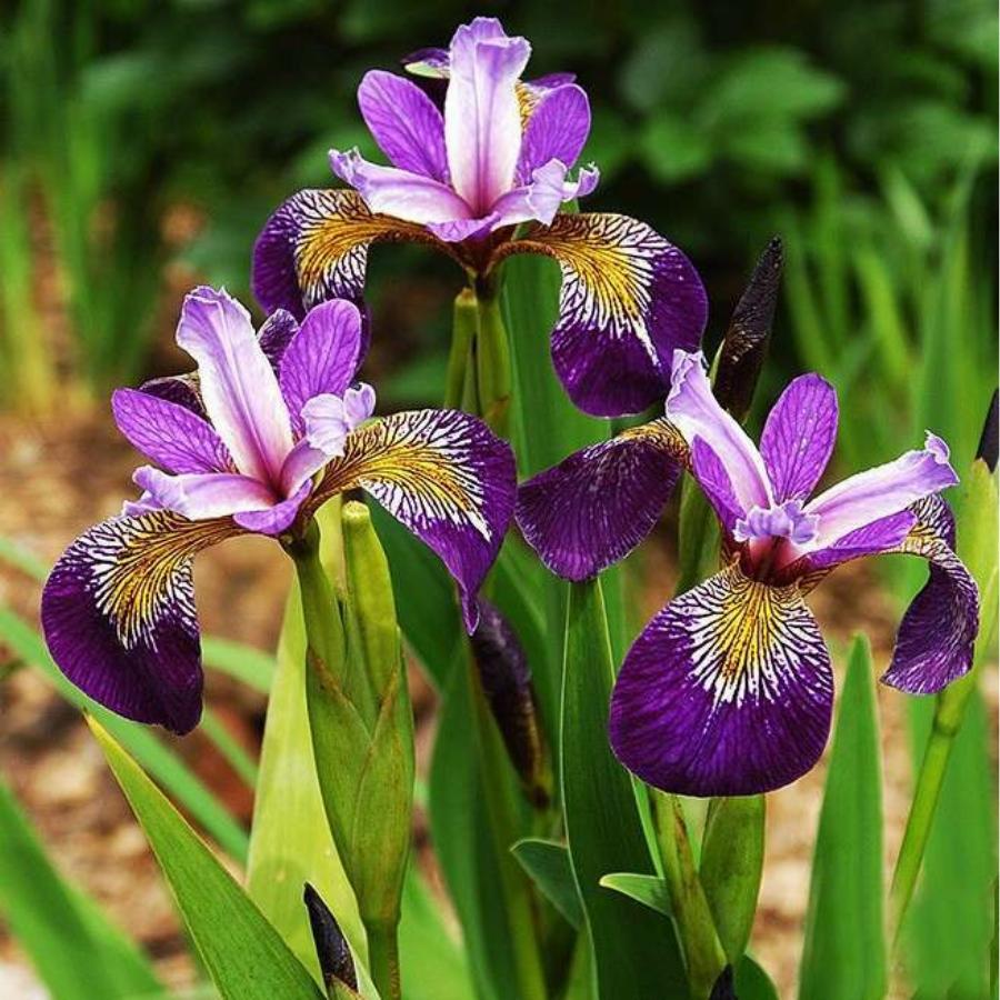 Ирис болотный «Spartacus». Высота: 110 см. Место посадки: солнце. Ирис болотный хорошо растёт в сырых местах и в прибрежных зонах. Листья зелёные, длинные. Цветки двухцветные, края лепестков тёмно-фиолетовые, в центре белый с жёлтым . Растёт быстро. Большие, красивые кусты.