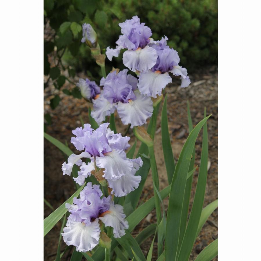 Ирис Adoregon цветет крупными и по-особенному привлекательными цветками, чьи лепестки имеют мелкие оборки по краям – изюминка сорта. Чистый белый цвет фолов удачно дополнен размытой бледно-синей окантовкой, в то время как стандарты окрашены в нежный фиолетово-синий цвет. Такое сочетание придает цветкам визуальной пышности и гармоничности, будто бы в их лепестках незаметно для посторонних глаз скрылась роскошная дама из прошлых веков. Красивейший метровый ирис, помимо внешней привлекательности, характеризуется устойчивостью к заболеваниям и обладает приятным сладким ароматом. Желтоватые пышные бородки завершают картину, прекрасно гармонируя с холодным тоном лепестков.