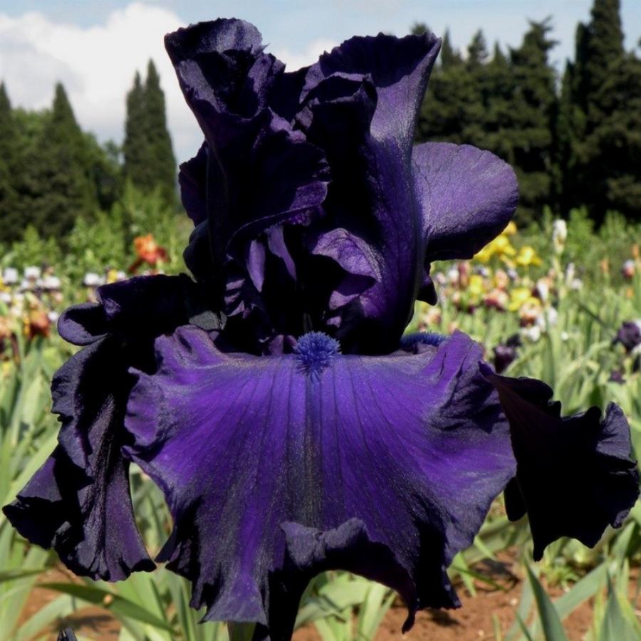 Сильно гофрированные огромные бархатистые, густо-сине-фиолетовые с почти чёрной бородкой цветки на высоких, прочных цветоносах. Сорт редкой окраски и завораживающей красоты! Аромат сладкий цветочный. Почётный отзыв, 1988. Награда за качество, 1990. Медаль Дайкса, 1992.