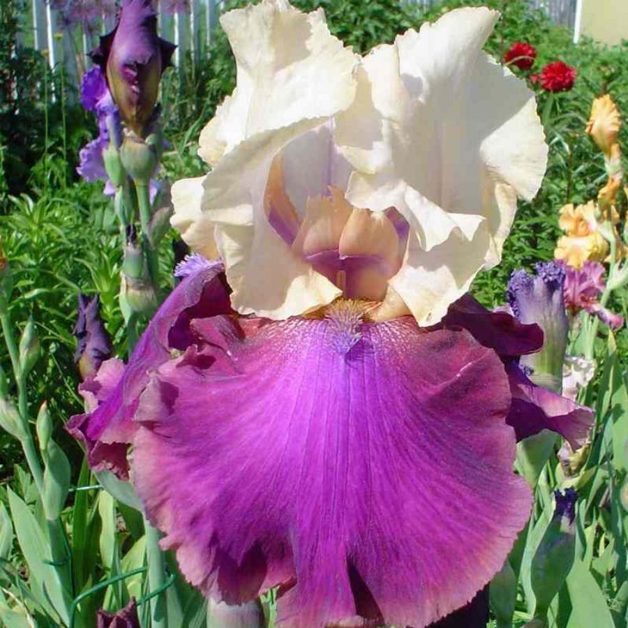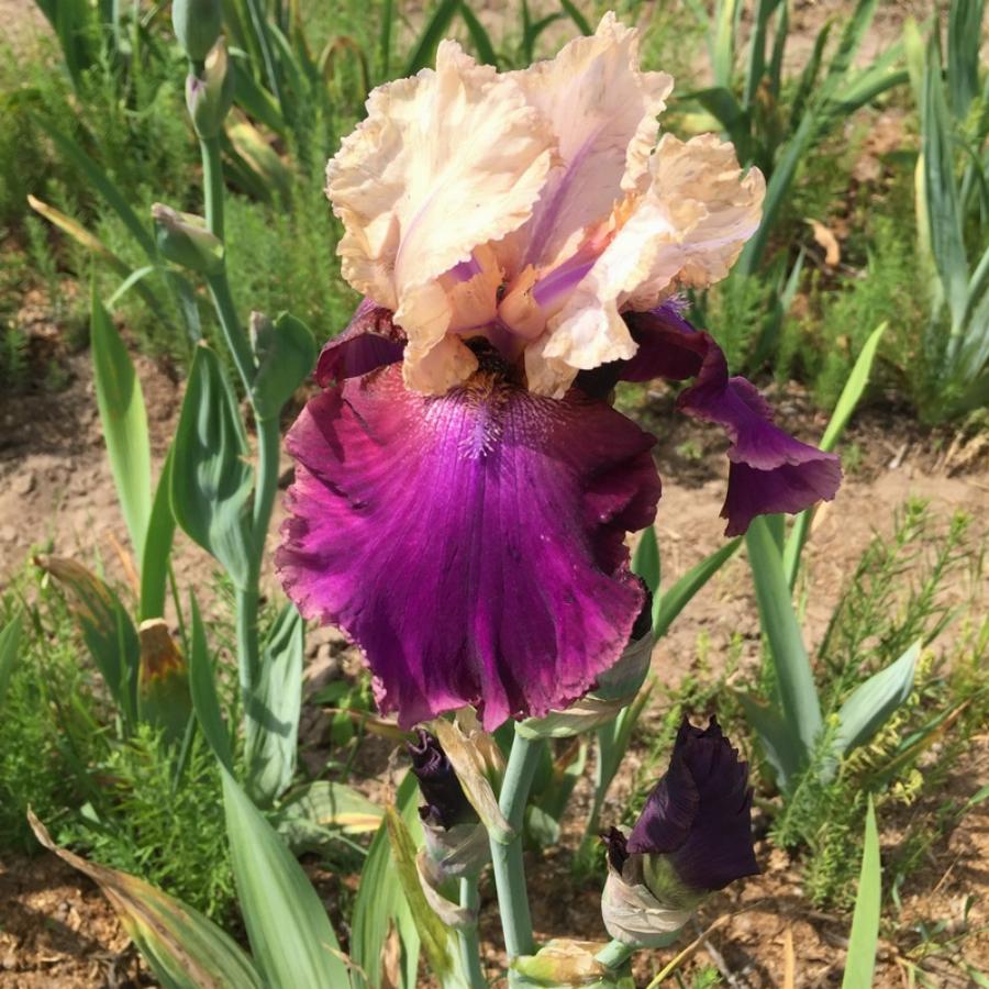 Цветки огромные, диаметром 16 см, гофрированные. На сильных цветоносах по 8 бутонов. Стандарты бежево-кремовые. Стайлы жёлтые. Фолы розово-фиолетовые. Бородка жёлтая с лавандовым кончиком. Аромат сладкий цветочный.