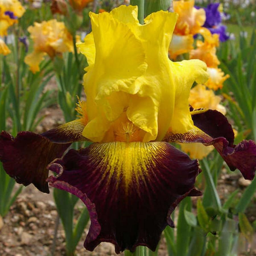 Высокорослый ирис Grenade, достигающий 100 см в высоту, цветет в середине сезона крупными и очень привлекательными бутонами. Чистого желтого цвета сочетаются с темно-бордовыми, желтыми у основания. Кроме того, Grenade прекрасно приспосабливается к высадке на любой клумбе, и весьма жизнеспособен.