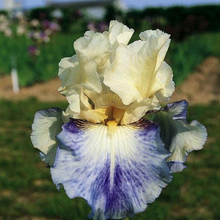 Утончённое и гармоничное сочетание цвета слоновой кости и светло-голубого. Стандарты кремовые. Фолы белые у основания, разбавленные бледно-голубым, с полосами более мягкого синего цвета. Бородка жёлтая. Этот поздноцветущий ирис высотой до 95 см часто даёт много стеблей от одного корневища и обильно цветёт
